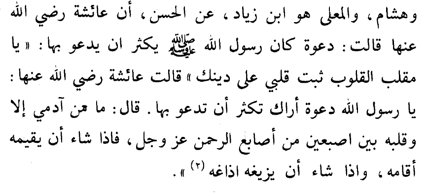 ʿA’ishah (may Allah be pleased with her) said: “O Messenger of Allah, I see that you often supplicate with this duʿā.” He (may the peace and blessings of Allah be upon him) said: “There is not a person except that his heart is between the two Fingers from the Fingers of the Most Merciful, the Mighty and Majestic. So, if He wishes to make him upright, He makes him upright―and if He wills for him to go astray, He sends him astray.”